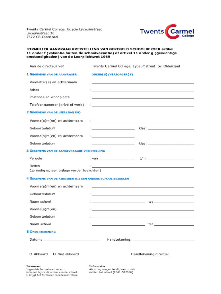 Twents Carmel College, locatie Lyceumstraat Lyceumstraat 36 7572 CR OldenzaalFORMULIER AANVRAAG VRIJSTELLING VAN GEREGELD SCHOOLBEZOEK artikel 11 onder f (vakantie buiten de schoolvakantie) of artikel