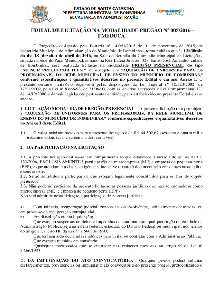 EDITAL DE LICITAO NA MODALIDADE PREGO N 005/2016FMEDUCA O Pregoeiro designado pela Portaria n 14.061/2015 de 01 de novembro de 2015, da Secretaria Municipal de Administrao do Municpio de Bombinhas,