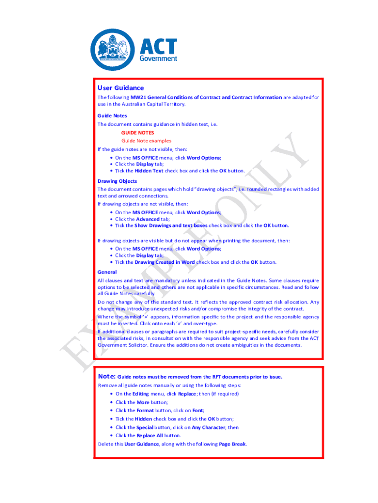 User Guidance The following MW21 General Conditions of Contract and Contract Information are adapted for use in the Australian Capital Territory. Guide Notes The document contains guidance in hidden