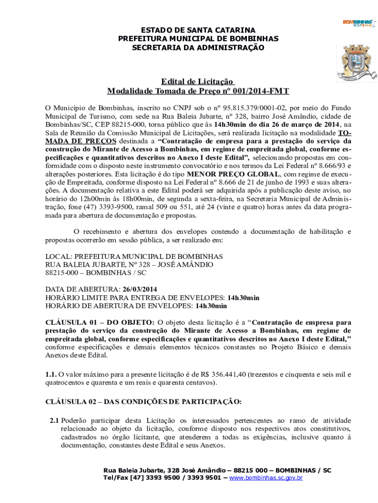 Obtenha o gratuito O Municpio de Bombinhas, inscrito no CNPJ sob o n 95