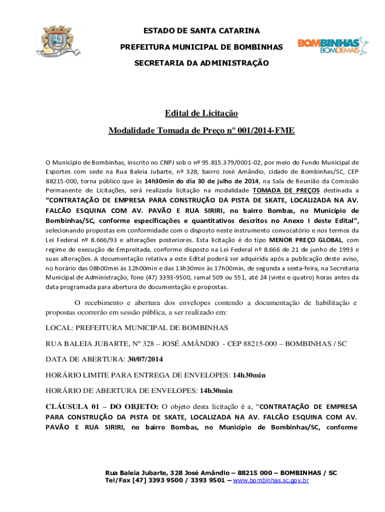 ESTADO DE SANTA CATARINA PREFEITURA MUNICIPAL DE BOMBINHAS SECRETARIA DA ADMINISTRAOEdital de Licitao Modalidade Tomada de Preo n 001/2014FMEO Municpio de Bombinhas, inscrito no CNPJ sob o n 95.815.379/000102,