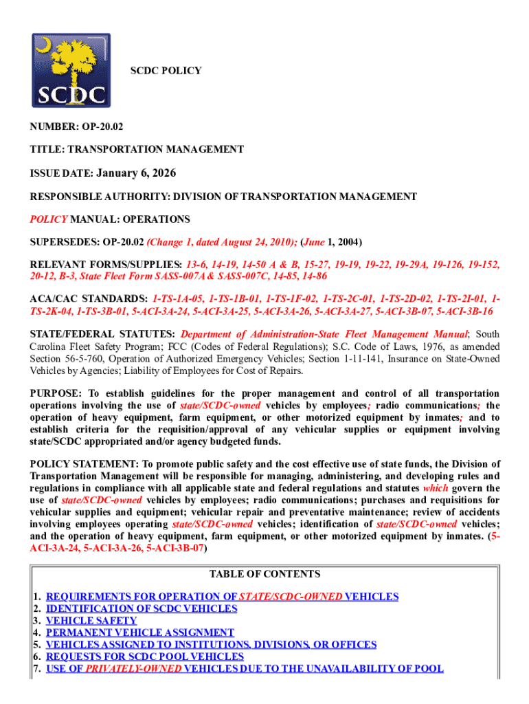 SCDC POLICYNUMBER: OP20.02 TITLE: TRANSPORTATION MANAGEMENT ISSUE DATE: January 6, 2026 RESPONSIBLE AUTHORITY: DIVISION OF TRANSPORTATION MANAGEMENT POLICY MANUAL: OPERATIONS SUPERSEDES: OP20.02 (Change