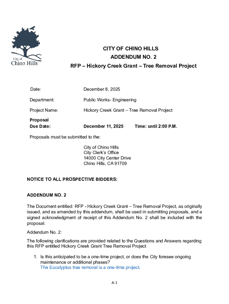 CITY OF CHINO HILLS ADDENDUM NO. 2 RFPHickory Creek GrantTree Removal ProjectDate:December 8, 2025Department:Public Works EngineeringProject Name:Hickory Creek GrantTree Removal ProjectProposal Due