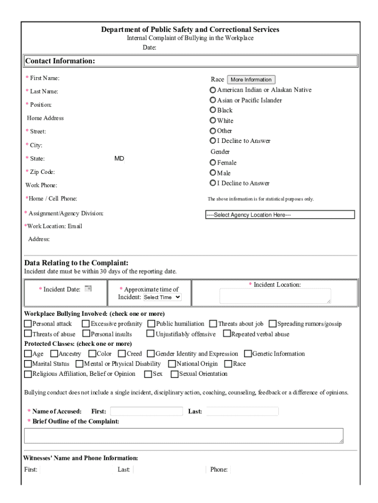 Get the free Internal Bullying in the Workplace Complaint Form.docx - dpscs maryland