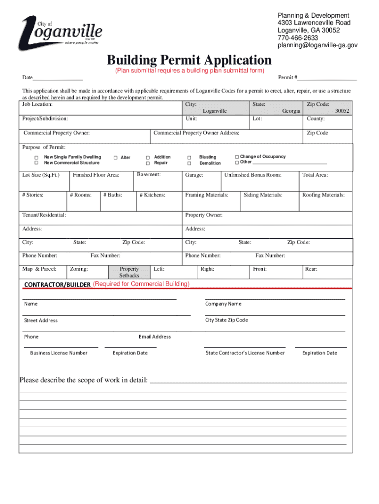 Planning & Development 4303 Lawrenceville Road Loganville, GA 30052 7704662633 planning@loganvillega.govBuilding Permit Application (Plan submittal requires a building plan submittal form) DatePermit
