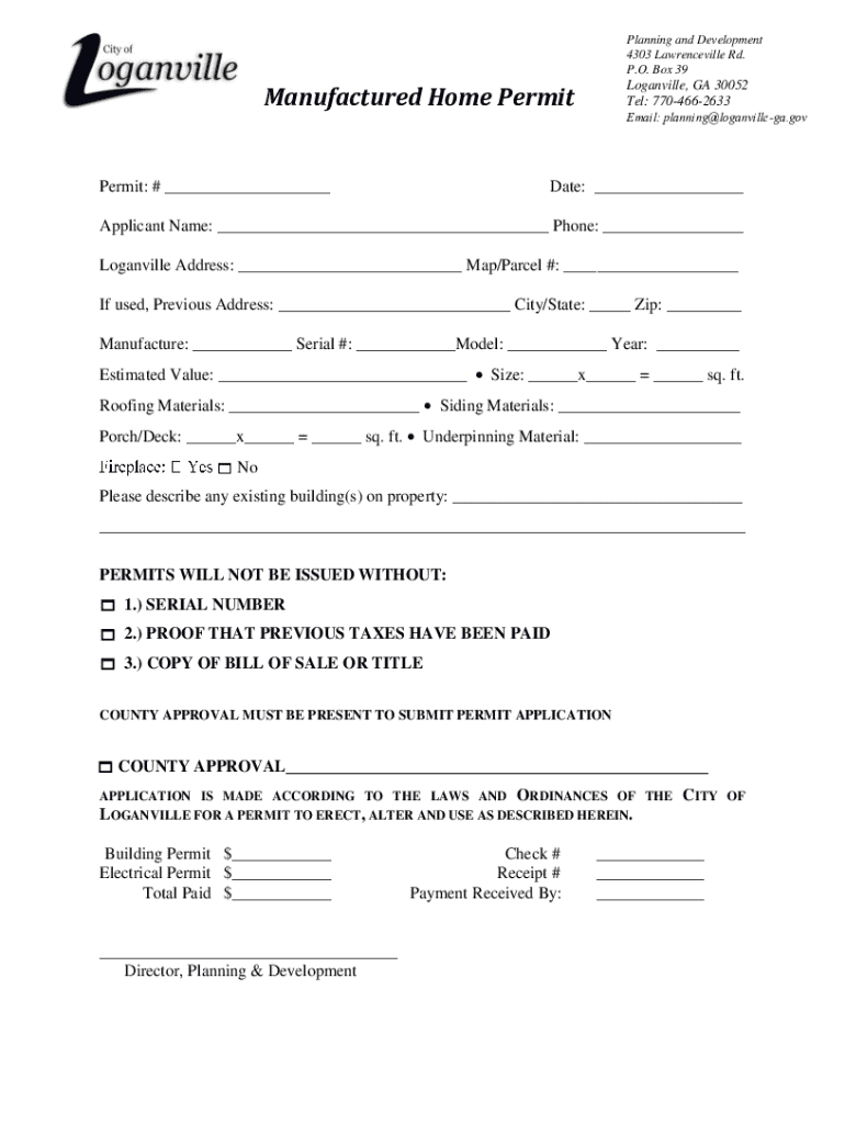Planning and Development 4303 Lawrenceville Rd. P.O. Box 39Loganville, GA 30052 Tel: 7704662633Manufactured Home PermitPermit: # ___Email: planning@loganvillega.govDate: ___Applicant Name: ___ Phone: