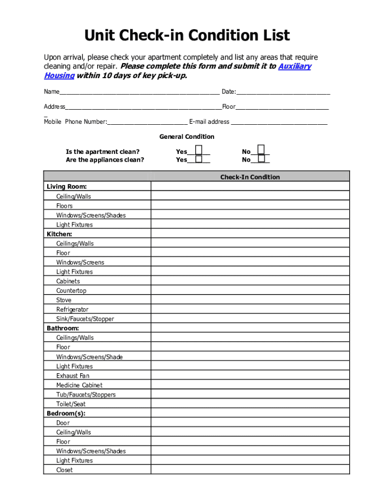Unit Checkin Condition List Upon arrival, please check your apartment completely and list any areas that require cleaning and/or repair. Please complete this form and submit it to AuxiliaryHousing