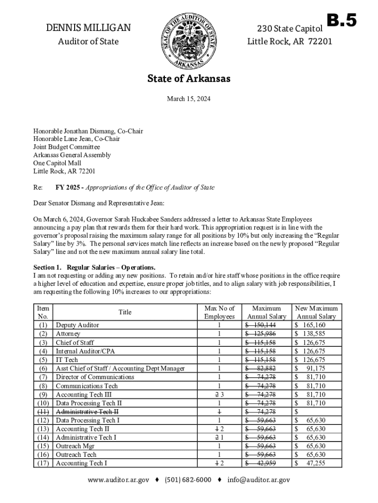 B.5DENNIS MILLIGAN230 State Capitol Little Rock, AR 72201Auditor of StateState of Arkansas March 15, 2024Honorable Jonathan Dismang, CoChair Honorable Lane Jean, CoChair Joint Budget Committee Arkansas