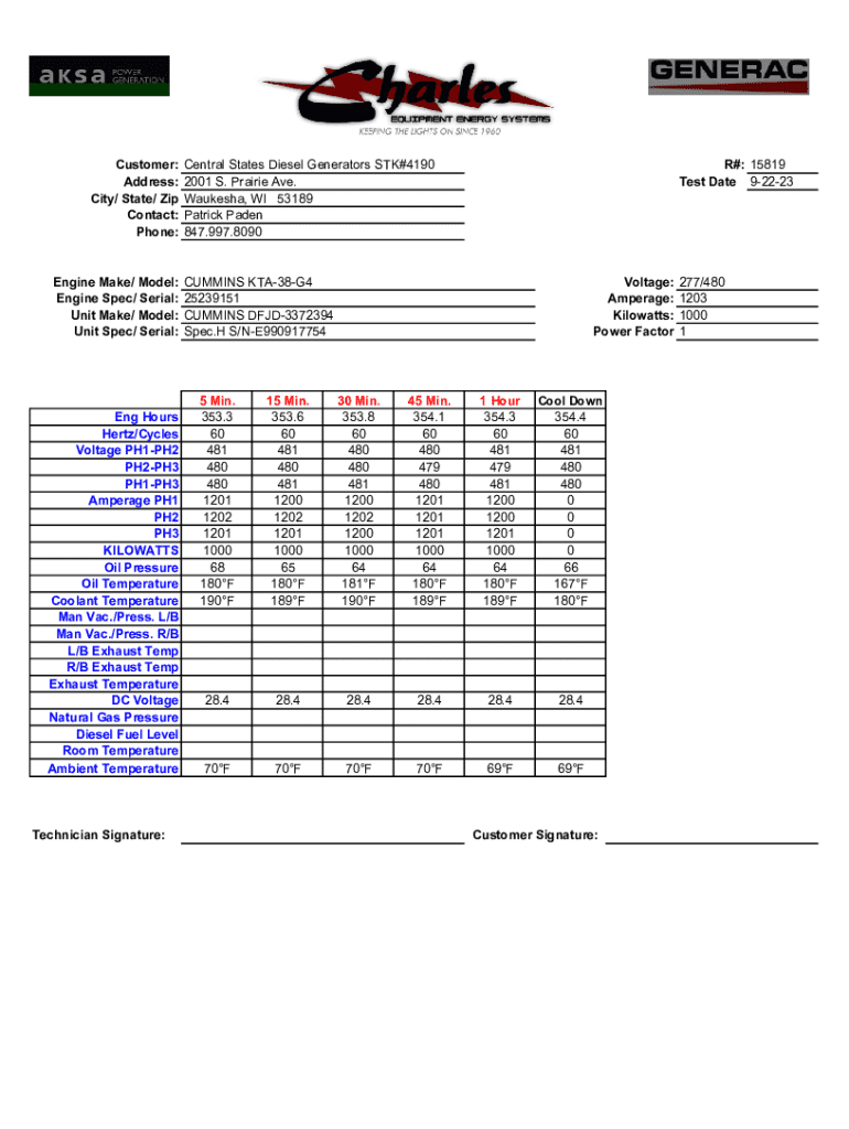 Customer: Central States Diesel Generators STK#4190 Address: 2001 S. Prairie Ave. City/ State/ Zip Waukesha, WI 53189 Contact: Patrick Paden Phone: 847.997.8090R#: 15819 Test Date 92223Engine Make/