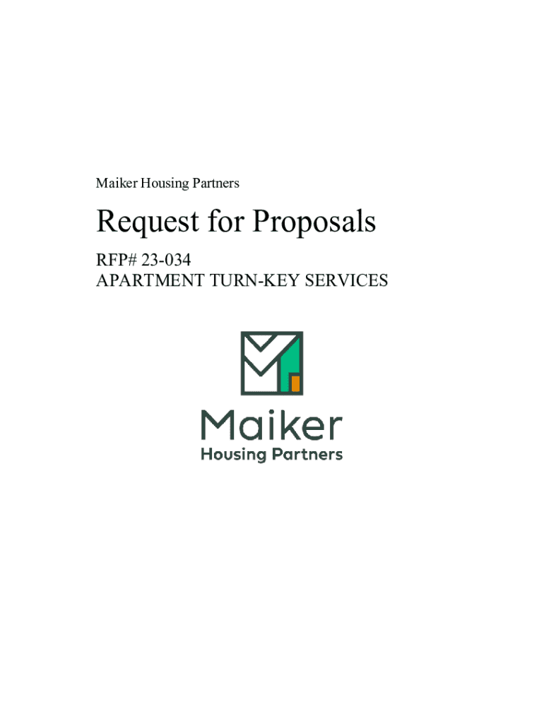 Maiker Housing PartnersRequest for Proposals RFP# 23034 APARTMENT TURNKEY SERVICESRFP# 23034, APT. TURNKEY SERVICES August 2023Table of Contents SectionDescriptionPage1.0About Maiker Housing Partners32.0RFP