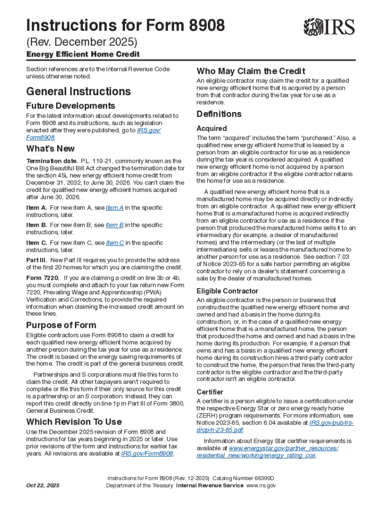 Form 8908 is a crucial document for taxpayers looking to claim specific energy-efficient home construction tax credits. Its primary purpose is to allow individuals and businesses to benefit from tax incentives under the Inflation Reduction Act, which supports efforts to reduce carbon footprints through enhanced energy efficiency in homebuilding. Filing Form 8908 is pivotal for eligible taxpayers since it can significantly reduce tax liabilities by leveraging available credits associated with constructing single-family homes.