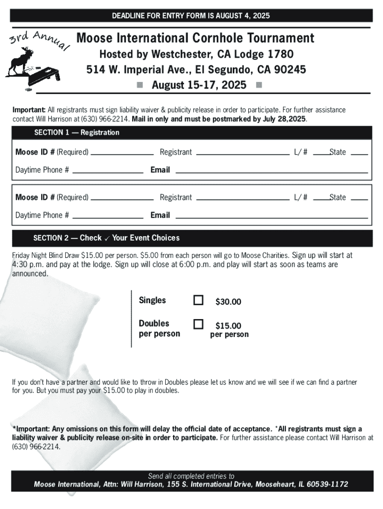 The UAL Moose International Cornhole Form plays a pivotal role in the organization of cornhole events. By standardizing the collection of participant information, it allows event organizers to systematically manage entries, teams, and schedules. Furthermore, utilizing a standardized form enhances the efficiency of processing registrations, thereby reducing administrative workload.