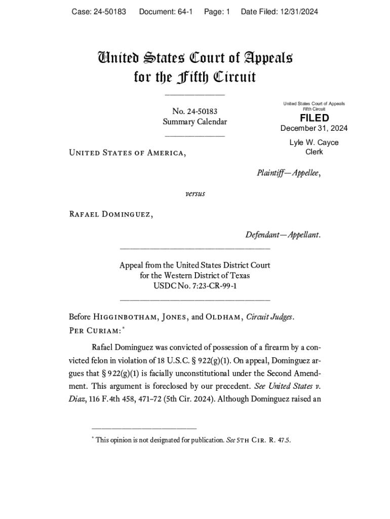 Case: 2450183Document: 641Page: 1Date Filed: 12/31/2024United States Court of Appeals for the Fifth Circuit ___ United States Court of Appeals Fifth CircuitNo. 2450183 Summary Calendar ___FILEDDecember