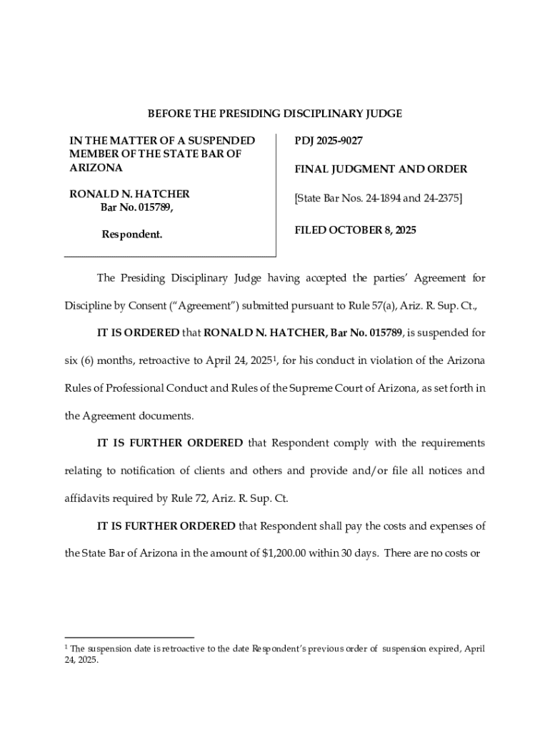 BEFORE THE PRESIDING DISCIPLINARY JUDGE IN THE MATTER OF A SUSPENDED MEMBER OF THE STATE BAR OF ARIZONAPDJ 20259027RONALD N. HATCHER Bar No. 015789,[State Bar Nos. 241894 and 242375]Respondent.FINAL