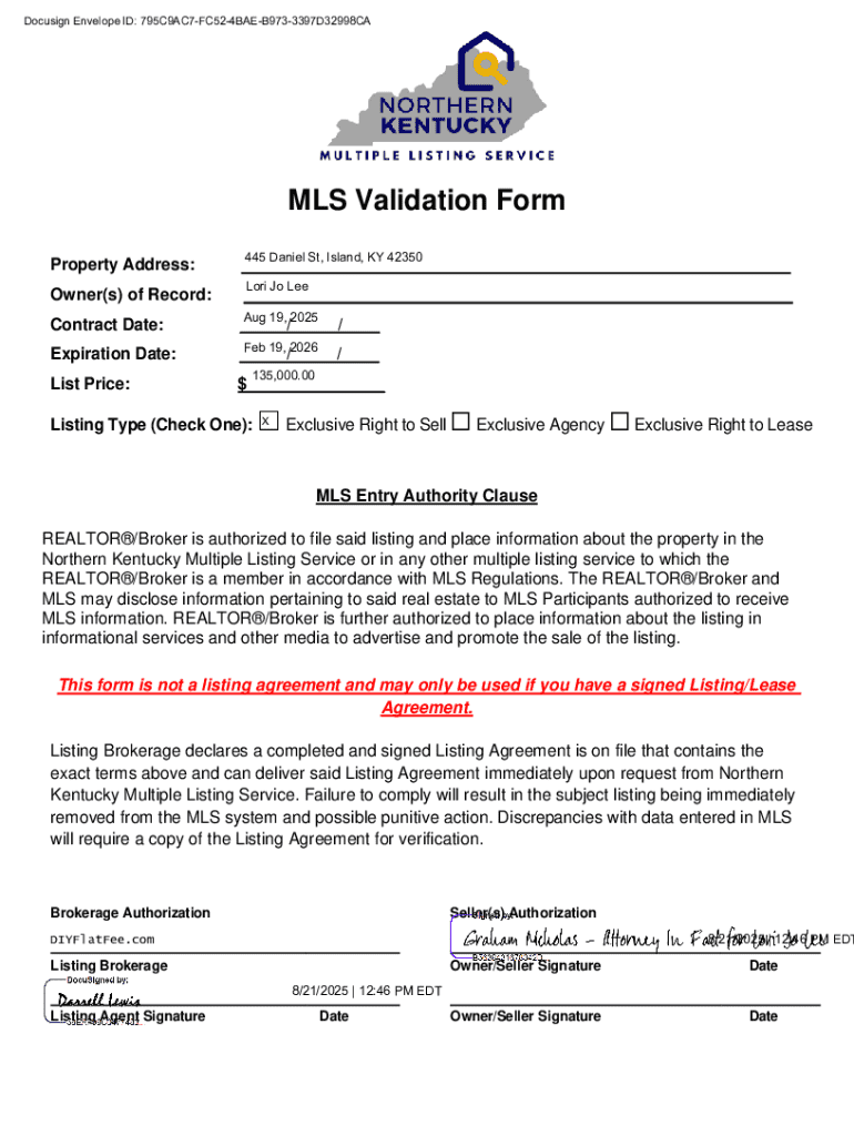Docusign Envelope ID: 795C9AC7FC524BAEB9733397D32998CA 0B49FB906A7B4CA1A4B2015483162380MLS Validation Form 445 Daniel St, Island, KY 42350Property Address:___Owner(s) of Record:___Contract Date:Aug