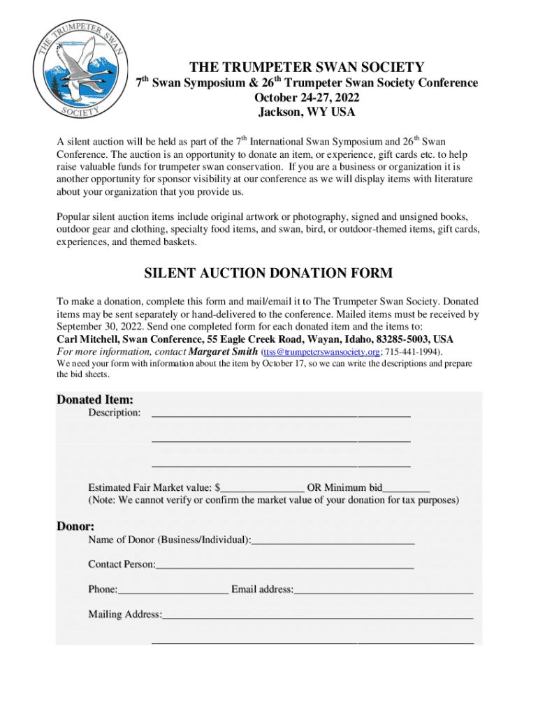 A well-structured auction form is essential for a successful silent auction. Key elements should include comprehensive item descriptions, estimated values, and detailed bidding instructions to guide participants. Also crucial is the contact information for organizers, enabling guests to reach out with any questions or clarifications. Ensuring clarity helps to maintain transparency and encourage competitive bidding, which ultimately benefits the organization.