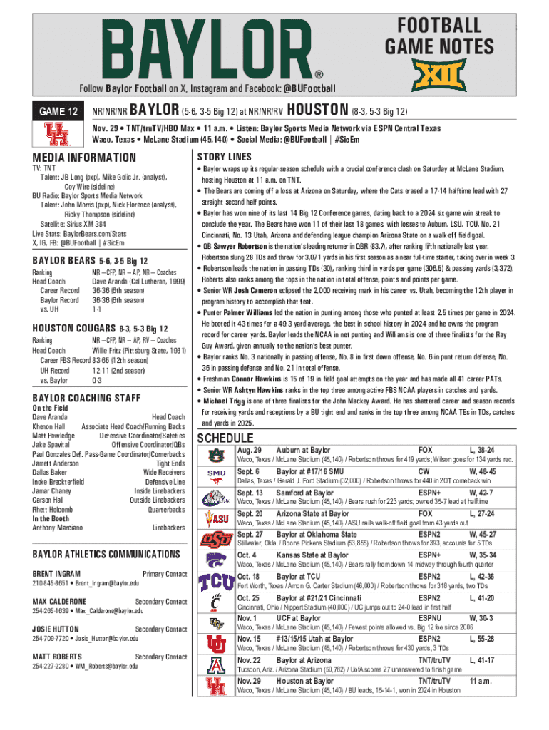 FOOTBALL GAME NOTES201617 BAYLOR BASKETBALL GAME NOTESGAME 1ORAL ROBERTSFollow Baylor Football on X, Instagram and Facebook: @BUFootball GAME 12NR/NR/NRBAYLOR (56, 35 Big 12) at NR/NR/RV HOUSTON (83,