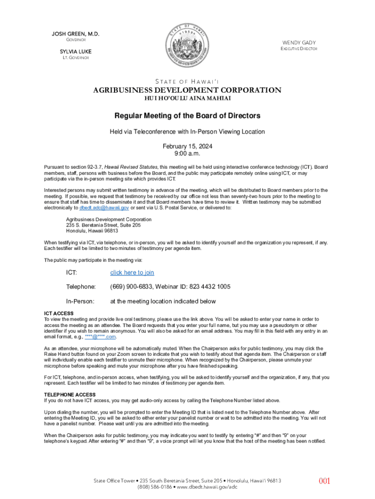 JOSH GREEN, M.D. GOVERNORWENDY GADY EXECUTIVE DIRECTORSYLVIA LUKE LT. GOVERNORSTATE OF HAWAIIAGRIBUSINESS DEVELOPMENT CORPORATION HUI HO\'OULU AINA MAHIAIRegular Meeting of the Board of Directors