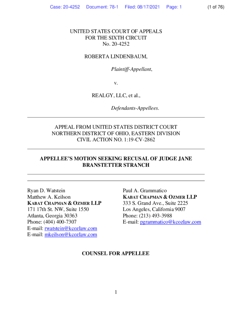 Case: 204252Document: 781Filed: 08/17/2021Page: 1UNITED STATES COURT OF APPEALS FOR THE SIXTH CIRCUIT No. 204252 ROBERTA LINDENBAUM, PlaintiffAppellant, v. REALGY, LLC, et al., DefendantsAppellees.APPEAL
