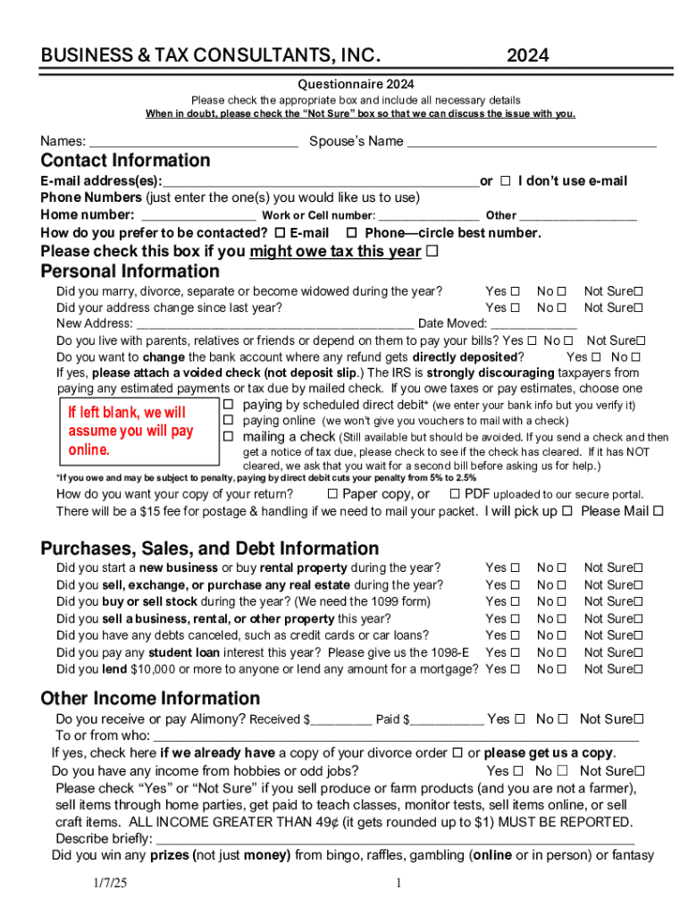 Get the free Questionnaire 2024 - Business & Tax Consultants, Inc.
