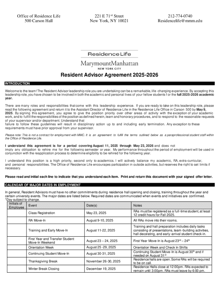 Get the free Resident Advisor Agreement 2025-2026