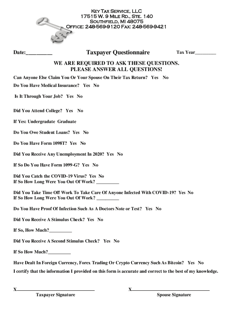 Key Tax Service, LLC 17515 W. 9 Mile Rd., Ste. 140 Southfield, MI 48075 Office: 2485699120 Fax: 2485699421Taxpayer QuestionnaireDate:___Tax Year___WE ARE REQUIRED TO ASK THESE QUESTIONS. PLEASE ANSWER