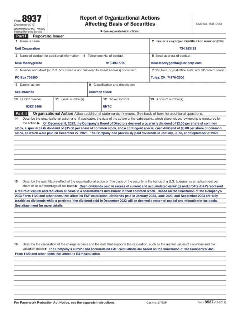 8937Report of Organizational Actions Affecting Basis of SecuritiesForm (December 2017) Department of the Treasury Internal Revenue ServicePart IOMB No. 15450123a See separate instructions.Reporting