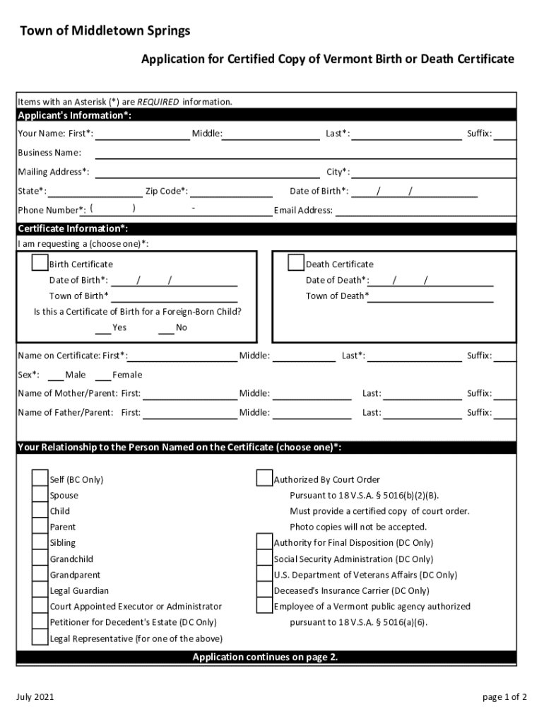 Get the free Certified Copy of Vermont Birth/Death Certificate Application