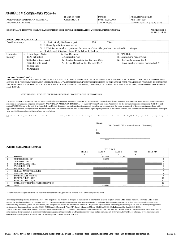 KPMG LLP CompuMax 255210 NORWEGIAN AMERICAN HOSPITAL Provider CCN: 140206In Lieu of Form CMS255210Period : From: 10/01/2017 To: 09/30/2018Run Date: 02/23/2019 Run Time: 13:47 Version: 2018.12 (02/01/2019)HOSPITAL