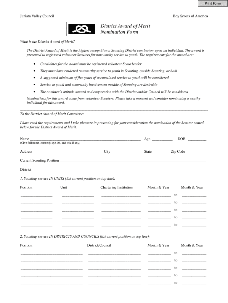 District Award Forms are essential documents used to recognize exemplary contributions and achievements within scouting and other community-based organizations. These forms are vital for ensuring that accolades are distributed fairly and transparently. Conceived to celebrate high standards of service and achievement, District Awards not only honor individuals but also serve as a motivational tool within the community, encouraging collective development and progress.