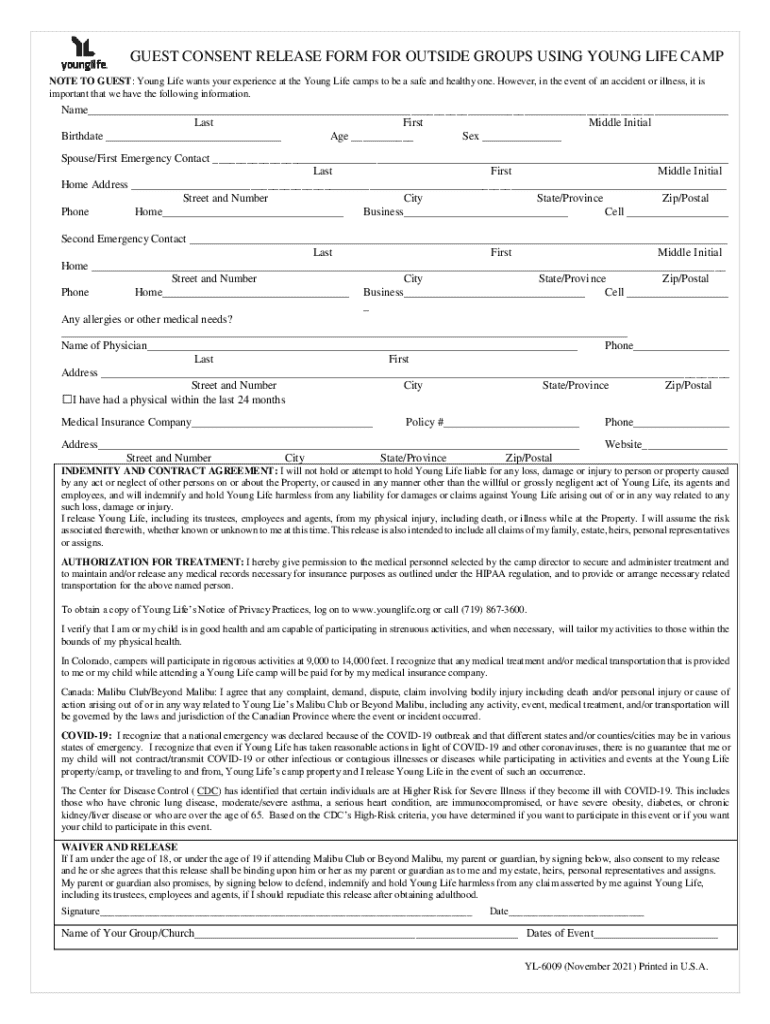 GUEST CONSENT RELEASE FORM FOR OUTSIDE GROUPS USING YOUNG LIFE CAMP NOTE TO GUEST: Young Life wants your experience at the Young Life camps to be a safe and healthy one. However, in the event of an