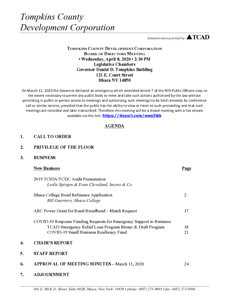 Tompkins County Development Corporation Administration provided byTCADTOMPKINS COUNTY DEVELOPMENT CORPORATION BOARD OF DIRECTORS MEETINGWednesday, April 8, 20202:30 PM Legislative Chambers Governor