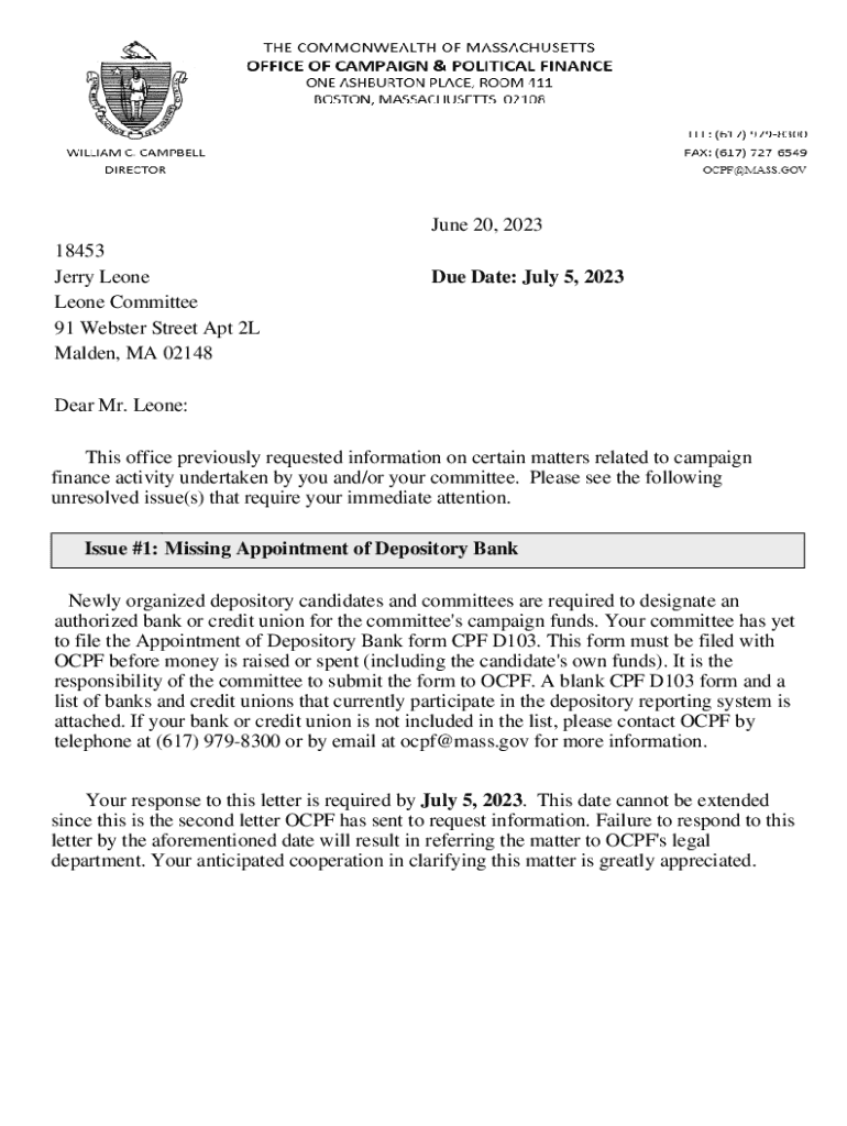 June 20, 2023 18453 Jerry Leone Leone Committee 91 Webster Street Apt 2L Malden, MA 02148Due Date: July 5, 2023Dear Mr. Leone: This office previously requested information on certain matters related