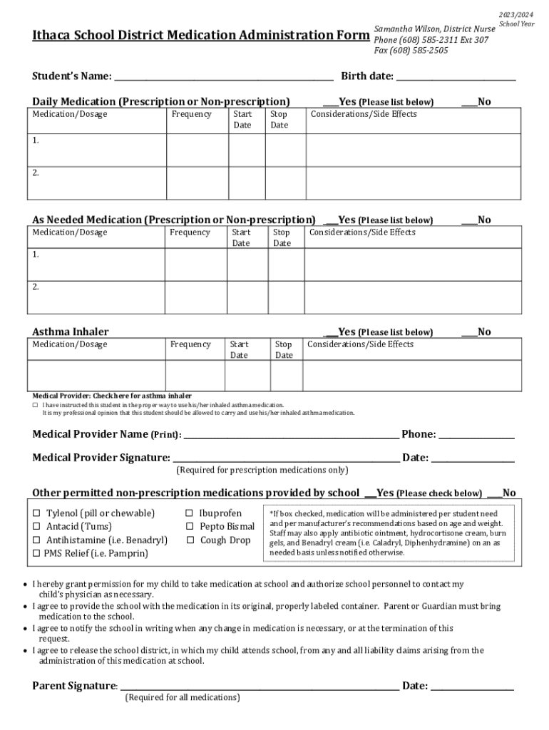 Samantha Wilson, District NurseIthaca School District Medication Administration Form Phone (608) 5852311 Ext 3072023/2024 School YearFax (608) 5852505Students Name: ___ Birth date: ___ Daily Medication