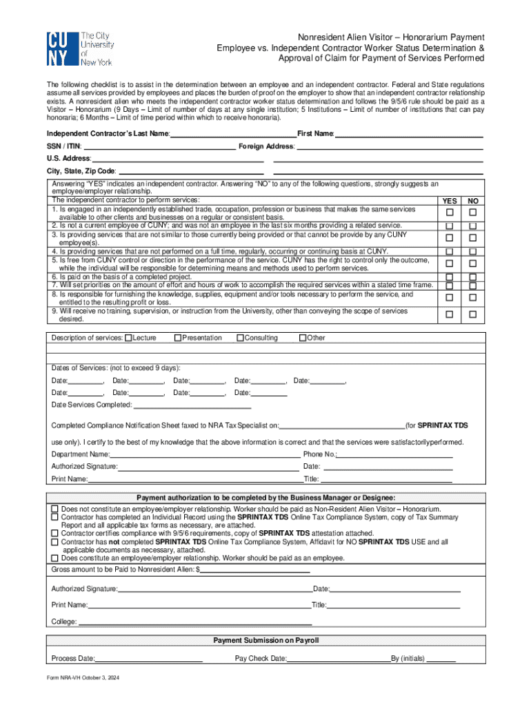 Nonresident Alien VisitorHonorarium Payment Employee vs. Independent Contractor Worker Status Determination & Approval of Claim for Payment of Services Performed The following checklist is to assist