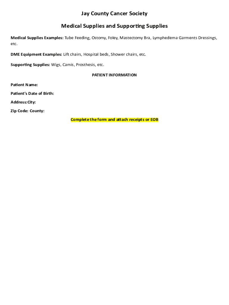 Jay County Cancer Society Medical Supplies and Supporting Supplies Medical Supplies Examples: Tube Feeding, Ostomy, Foley, Mastectomy Bra, Lymphedema Garments Dressings, etc. DME Equipment Examples: