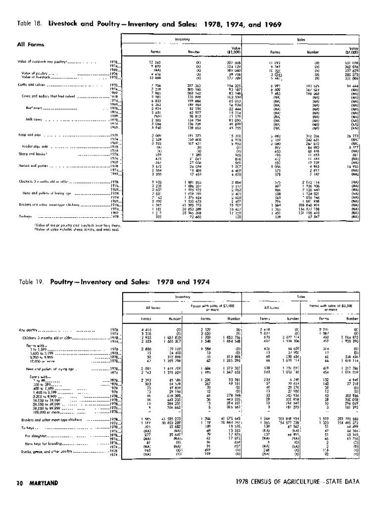 Table 18.Livestock and Poultry Inventory and Sales:1978, 1974, and 1969InventorySalesAll FarmsValueValuefarmsNumber($1,(lOO)farmsNumber($1,(lOO)Value of livestock and poultry\' ___ 1976_ 1974_ 1969_