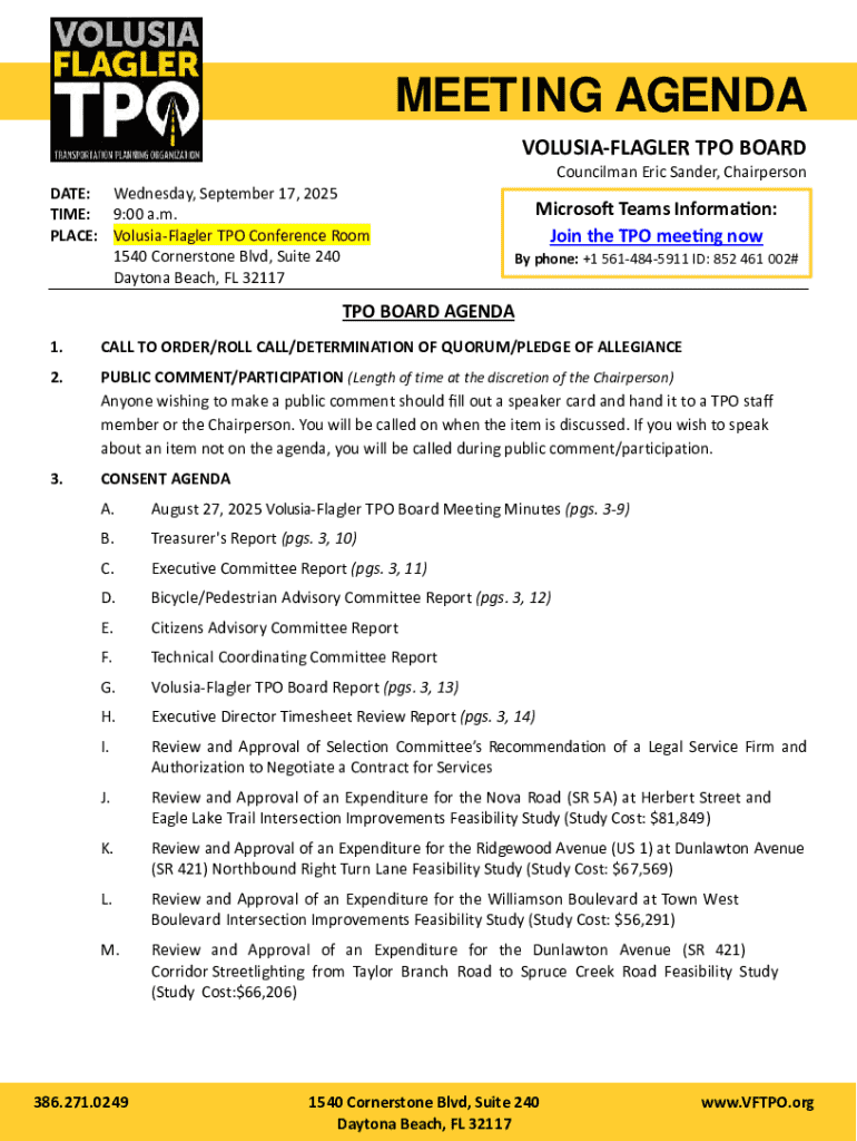 The significance of the Volusia-Flagler TPO Executive Form extends beyond individual submissions; it is a vital tool for teams and agencies working collaboratively on regional transportation planning. All stakeholders, including local governments, planners, and citizens, can benefit from a clear understanding of the form's requirements and processes. Eligibility to fill out the form generally involves individuals or entities that are proposing transportation projects aimed at improving mobility and accessibility across the area.