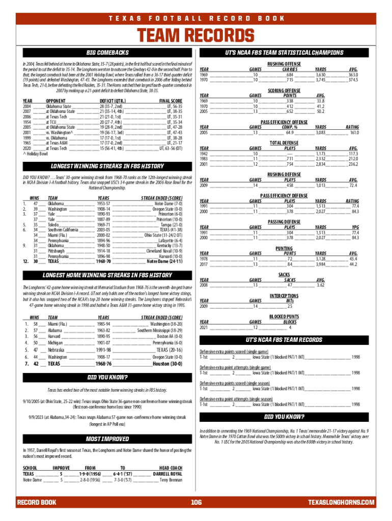 The Texas football all-time record form plays a critical role in capturing this wealth of information, ensuring it is both accessible and easy to understand. By organizing performance metrics and milestones, this form allows users to visualize and appreciate the long-standing traditions and achievements of Texas football.