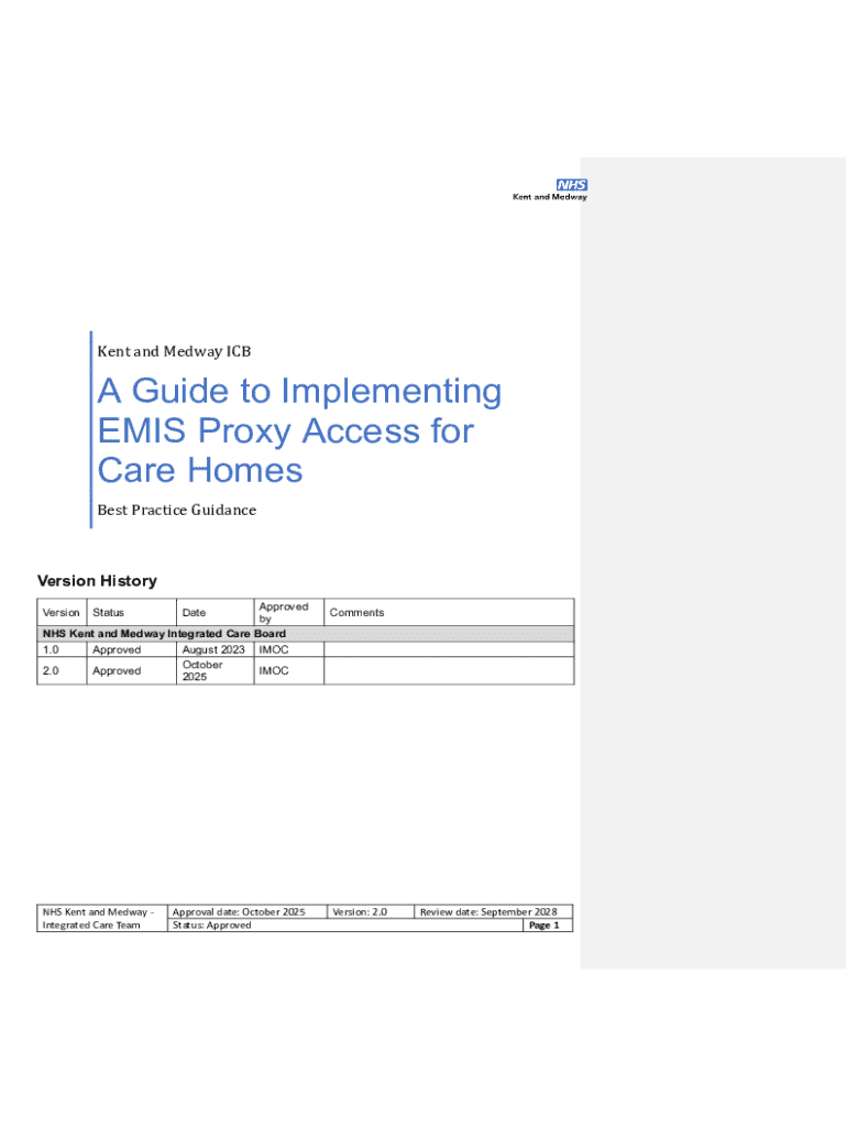 Kent and Medway ICBA Guide to Implementing EMIS Proxy Access for Care Homes Best Practice GuidanceVersion History Approved by NHS Kent and Medway Integrated Care Board 1.0 Approved August 2023 IMOC