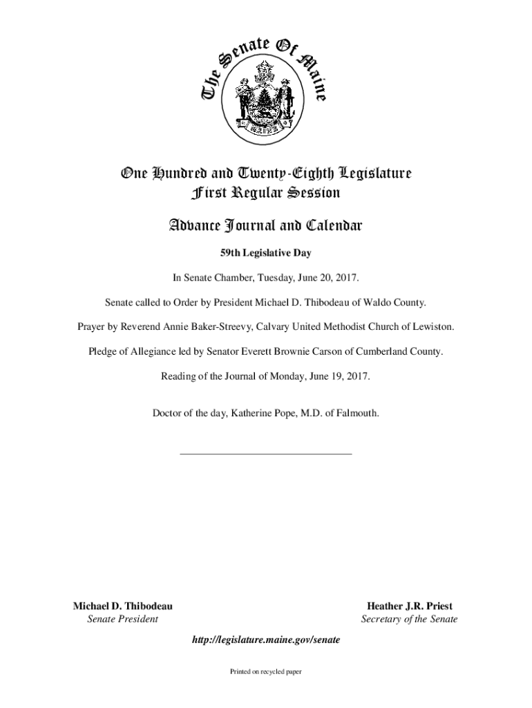 One Hundred and TwentyEighth Legislature First Regular Session Advance Journal and Calendar 59th Legislative Day In Senate Chamber, Tuesday, June 20, 2017. Senate called to Order by President Michael