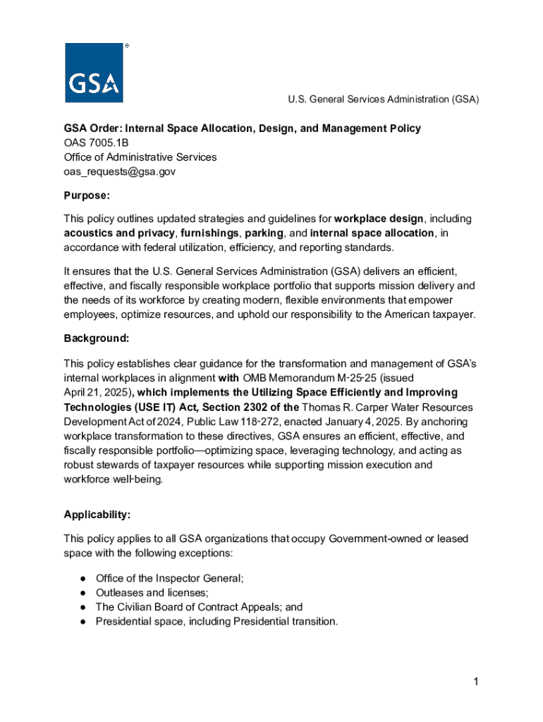 U.S. General Services Administration (GSA)GSA Order: Internal Space Allocation, Design, and Management Policy OAS 7005.1B Office of Administrative Services oas_requests@gsa.gov Purpose: This policy