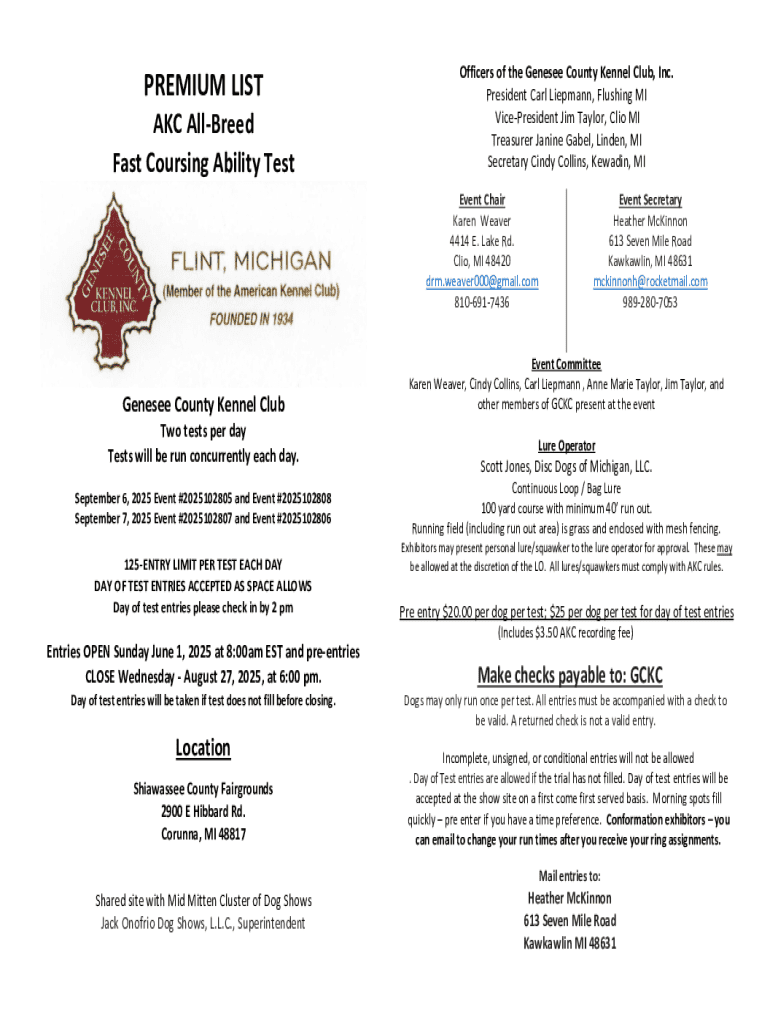 PREMIUM LIST AKC AllBreed Fast Coursing Ability TestOfficers of the Genesee County Kennel Club, Inc. President Carl Liepmann, Flushing MI VicePresident Jim Taylor, Clio MI Treasurer Janine Gabel,