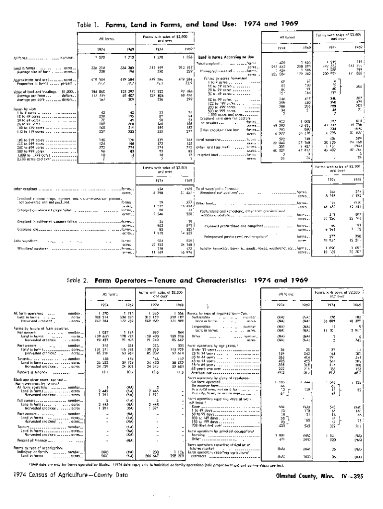 Farms, Land in Farms, and Land Use:Tobie 1.Forms with sales of $2,500All formsAll farms ___ number __1974 and 196919741969197419691 5701 7101 3701 356land in farms ___ acres __ Average size of farm