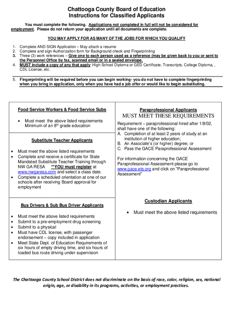 Chattooga County Board of Education Instructions for Classified Applicants You must complete the following. Applications not completed in full will not be considered for employment. Please do not