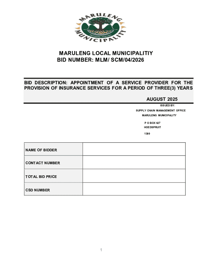 MARULENG LOCAL MUNICIPALITIY BID NUMBER: MLM/ SCM/04/2026BID DESCRIPTION: APPOINTMENT OF A SERVICE PROVIDER FOR THE PROVISION OF INSURANCE SERVICES FOR A PERIOD OF THREE(3) YEARS AUGUST 2025 ISSUED