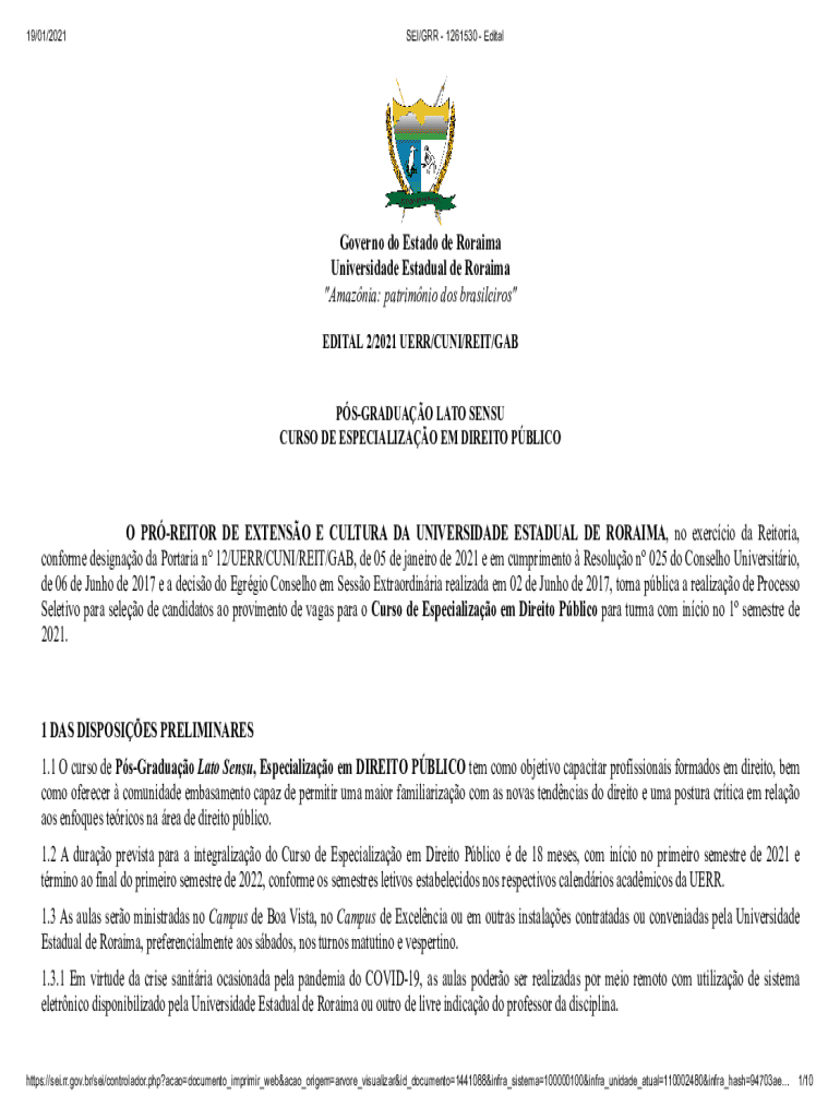 19/01/2021SEI/GRR1261530EditalGoverno do Estado de Roraima Universidade Estadual de Roraima \"Amaznia: patrimnio dos brasileiros\" EDITAL 2/2021 UERR/CUNI/REIT/GAB PSGRADUAO LATO SENSU CURSO DE ESPECIALIZAO