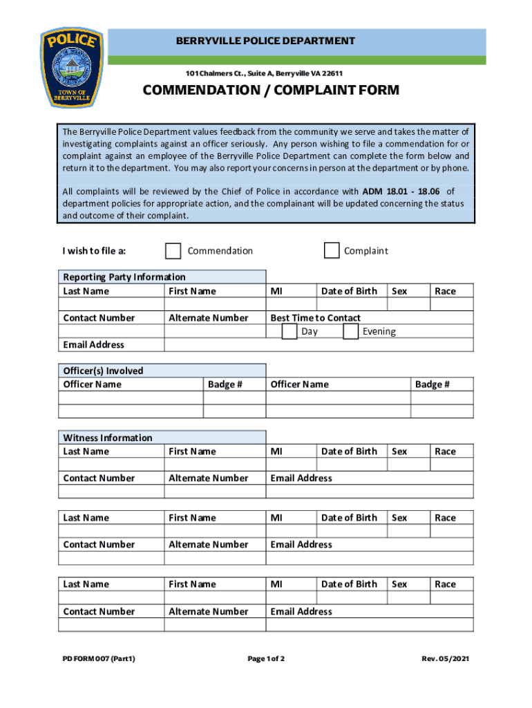 Get the free berryville police department - commendation / complaint form