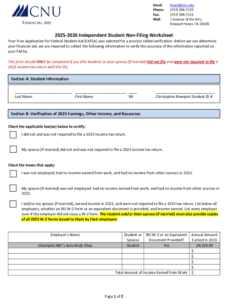 Get the free 2025-2026 Independent Student Non-Filing Worksheet