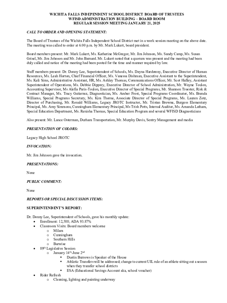 Get the free The Wichita Falls ISD Board of Trustees held its scheduled ...